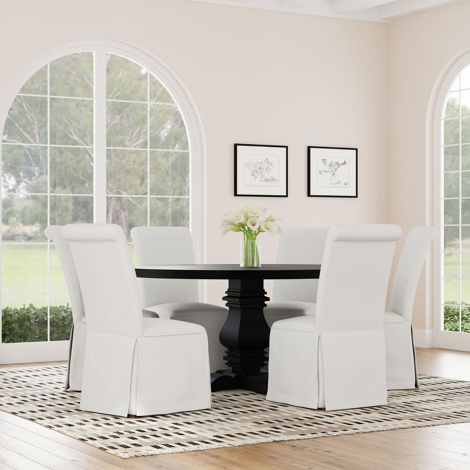 Put a stylish, somewhat formal spin on your dining room decor with a set of two classic parson chairs. Each features a tall back with an armless profile for impeccable comfort and elegance. The chair features plush foam padding, complete with neutral upholstery for a fresh, inviting presence at your dining table. The chairs showcase fully skirted silhouette, adding a touch of flowing movement. Tall, rolled backs ensure supportive seating for friends and family, wonderful for daily and occasional use.