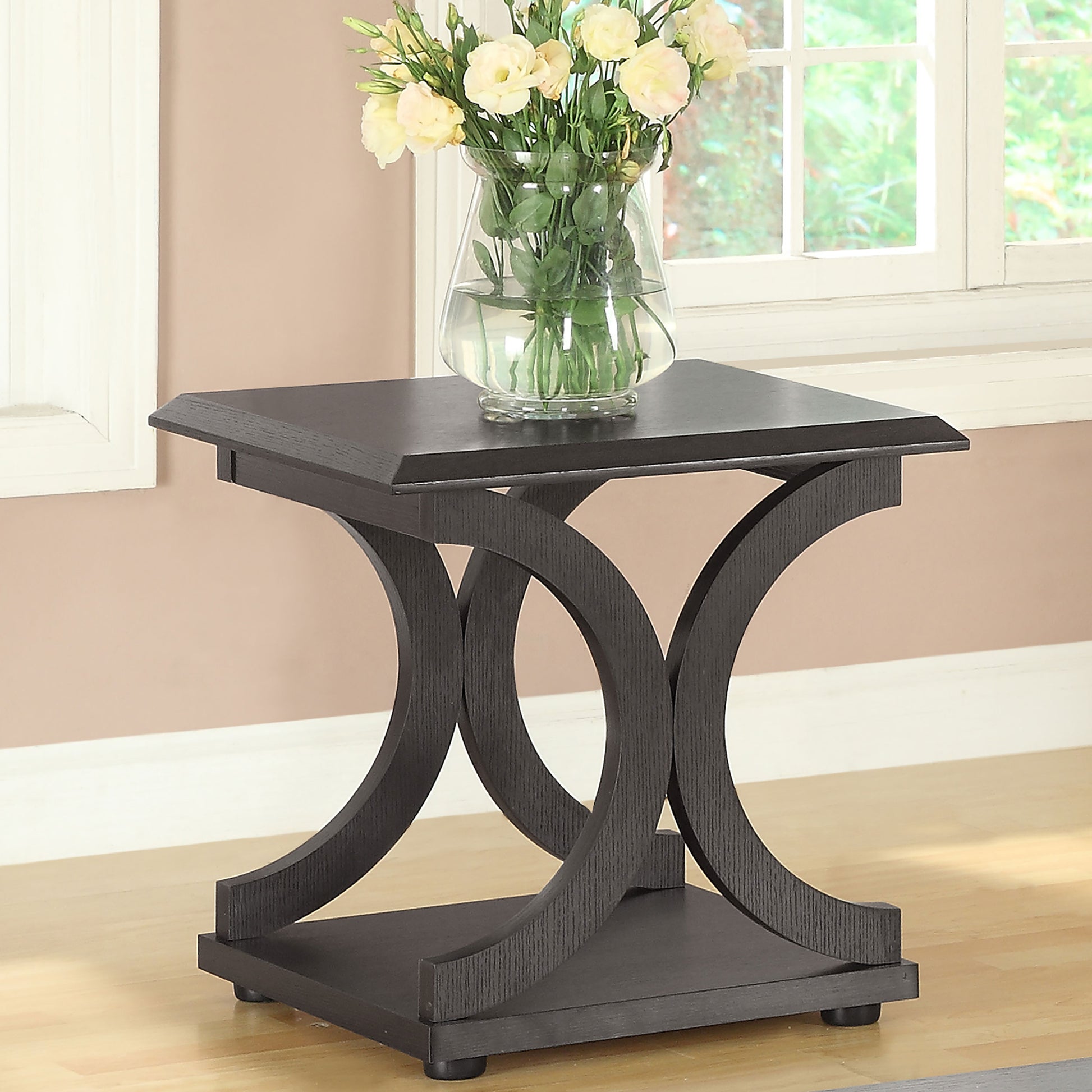 Enhance your living space with this stylish end table, designed with bold circular accents for a modern aesthetic. The cappuccino finish provides a rich, warm tone, while the durable engineered wood construction ensures long-lasting performance. Its scratch-resistant laminate veneer surface is perfect for maintaining a polished look over time. A spacious tabletop and lower shelf offer ample room for decor or essentials, making this side table a versatile addition to any living room or seating area.