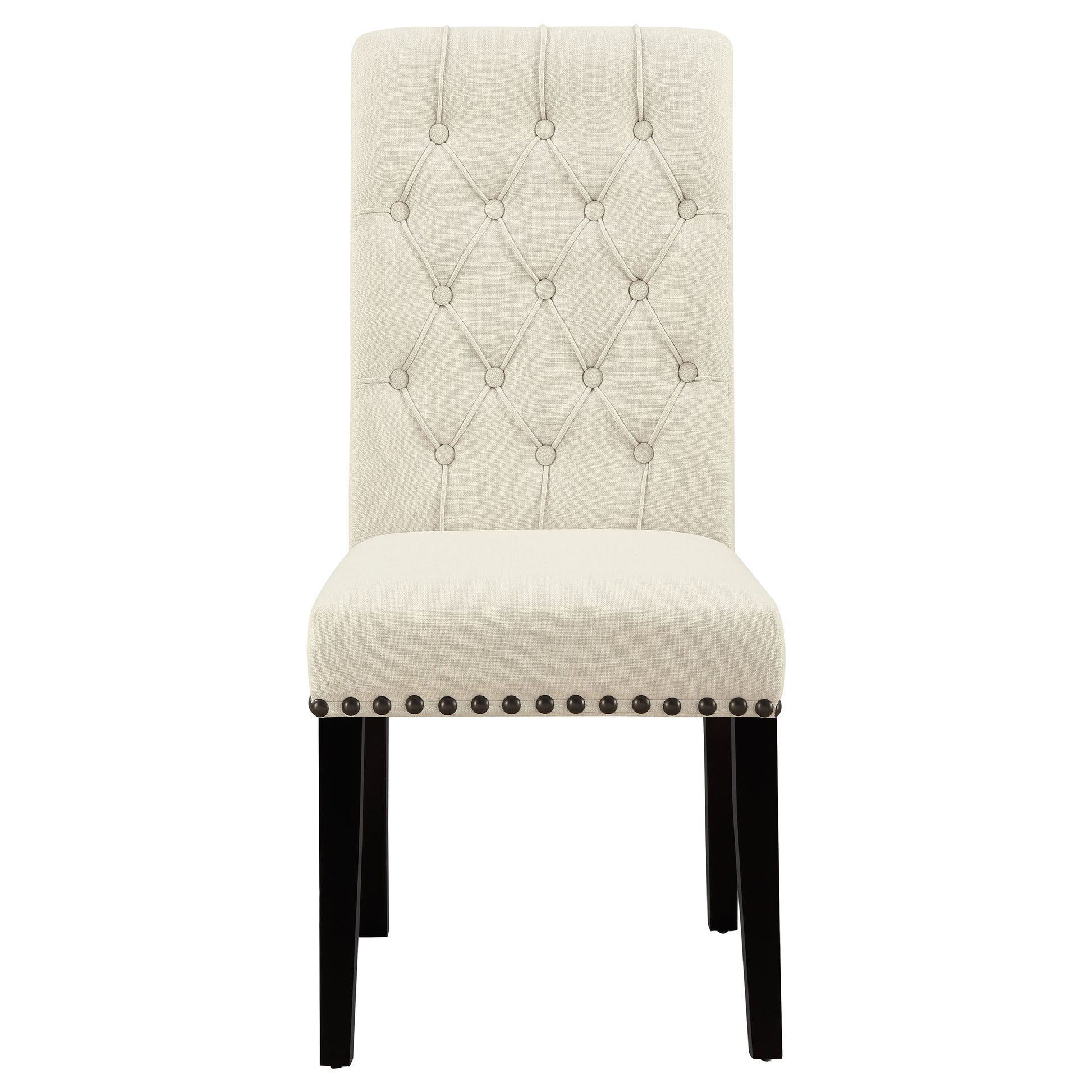 This elegant, contemporary, five-piece dining set completes formal dining experiences with a round, white, cultured marble, and rustic espresso pedestal table and four upholstered parson style side chairs. Charming details like button-tufted rolled backrests, bold nailhead trim, and flared legs lend a classical approach with modern elements.