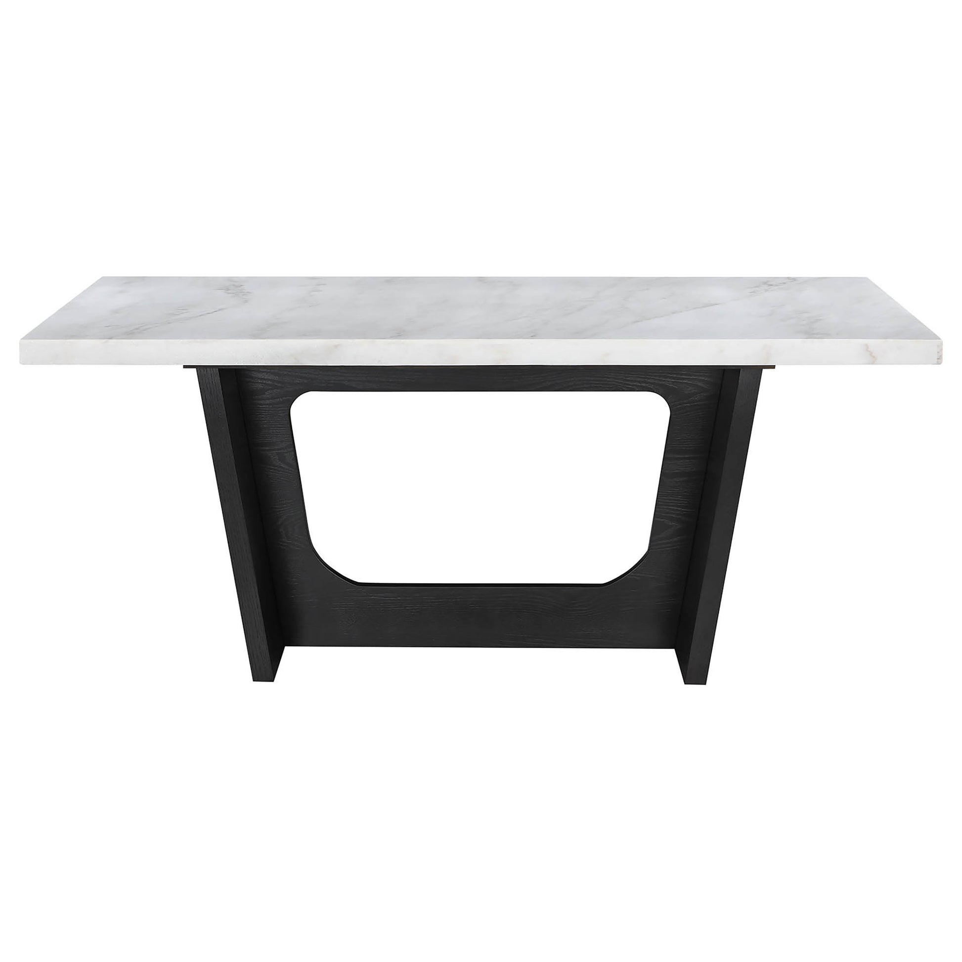 Bring together family and friends at this modern rustic style dining table set. The table features a rectangular, thick, white marble top that is spacious enough for six people. Sleek open and airy trestle base with a center punch out, rustic espresso striking color combination lends a dramatic touch and grounds the room elegantly. The set of chairs with a rolled backrest with button-tufted details lends a traditional aesthetic to a space. Also, bringing to your home the classic elements is a padded seat with individual nailhead trim that offers a charming detail.
