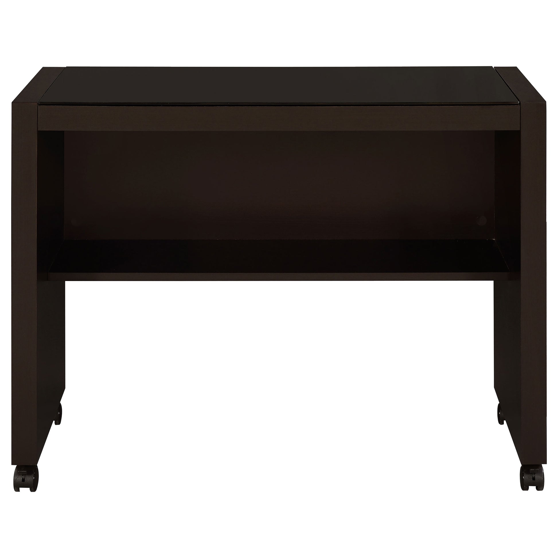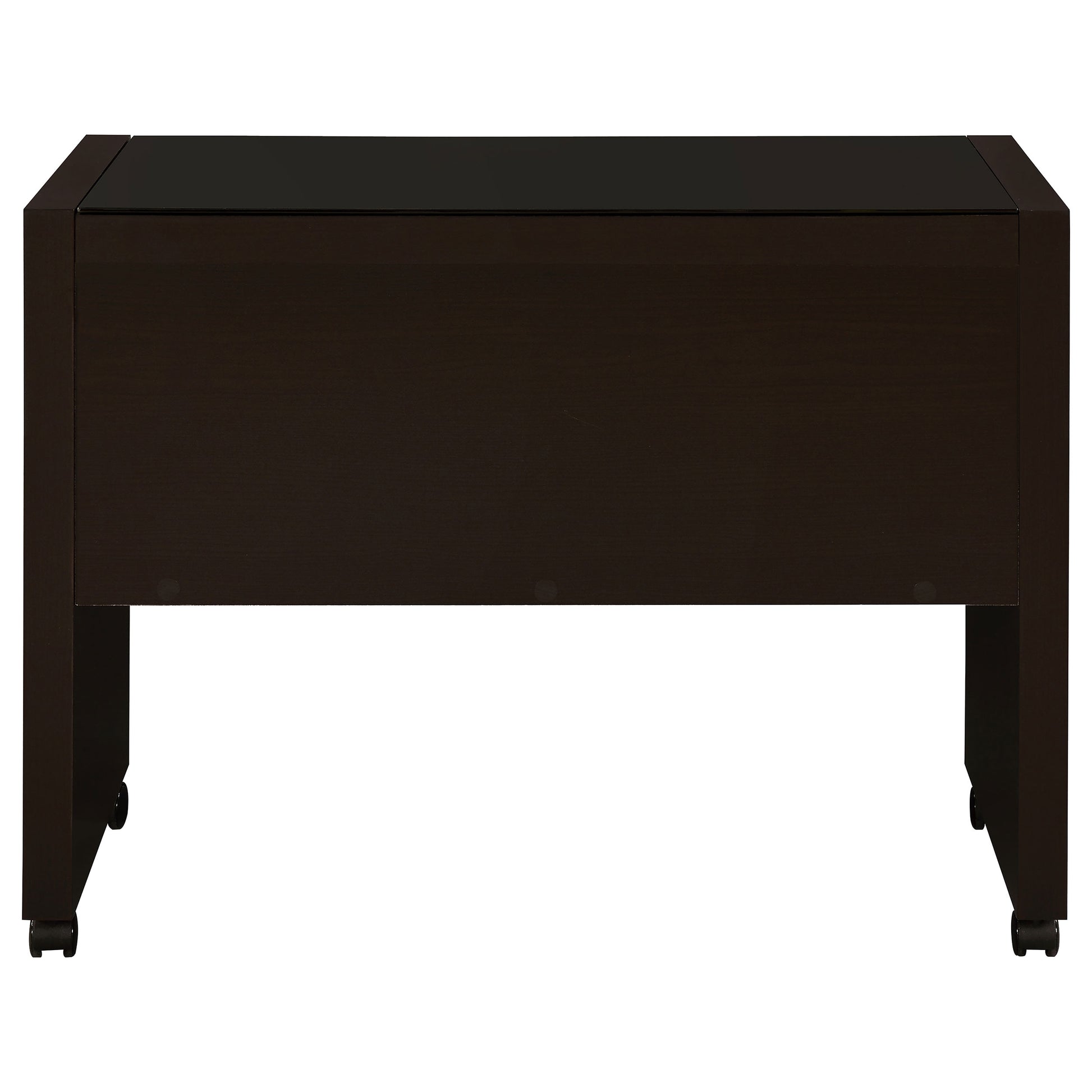 Enhance your office setup with this sleek and functional mobile return, designed to provide extra storage and workspace flexibility. The rich cappuccino finish adds a touch of modern sophistication, while the black tempered glass top elevates its contemporary appeal. A built-in storage shelf keeps office supplies, books, or essentials neatly organized. Designed with smooth-rolling casters, this unit offers effortless mobility, allowing you to reposition it with ease. Crafted from engineered wood, glass, and laminate veneer, this mobile return is a stylish and practical addition to any office.