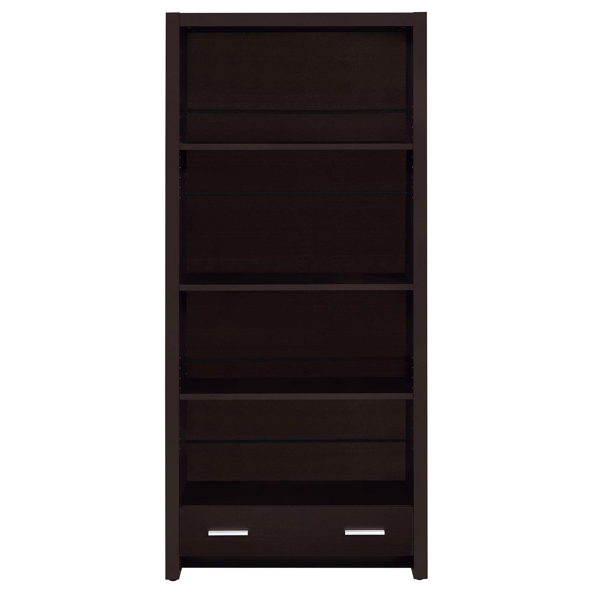 Enhance your office or living space with this modern bookcase, offering both open shelving and concealed storage. The rich cappuccino finish brings a warm and sophisticated touch, while four spacious shelves provide ample room for books, décor, and office essentials. Two adjustable shelves allow for customizable organization, while a lower drawer with sleek silver handles offers discreet storage. Built from durable engineered wood and laminate veneer, this bookcase is a stylish and practical addition to any workspace or home library.