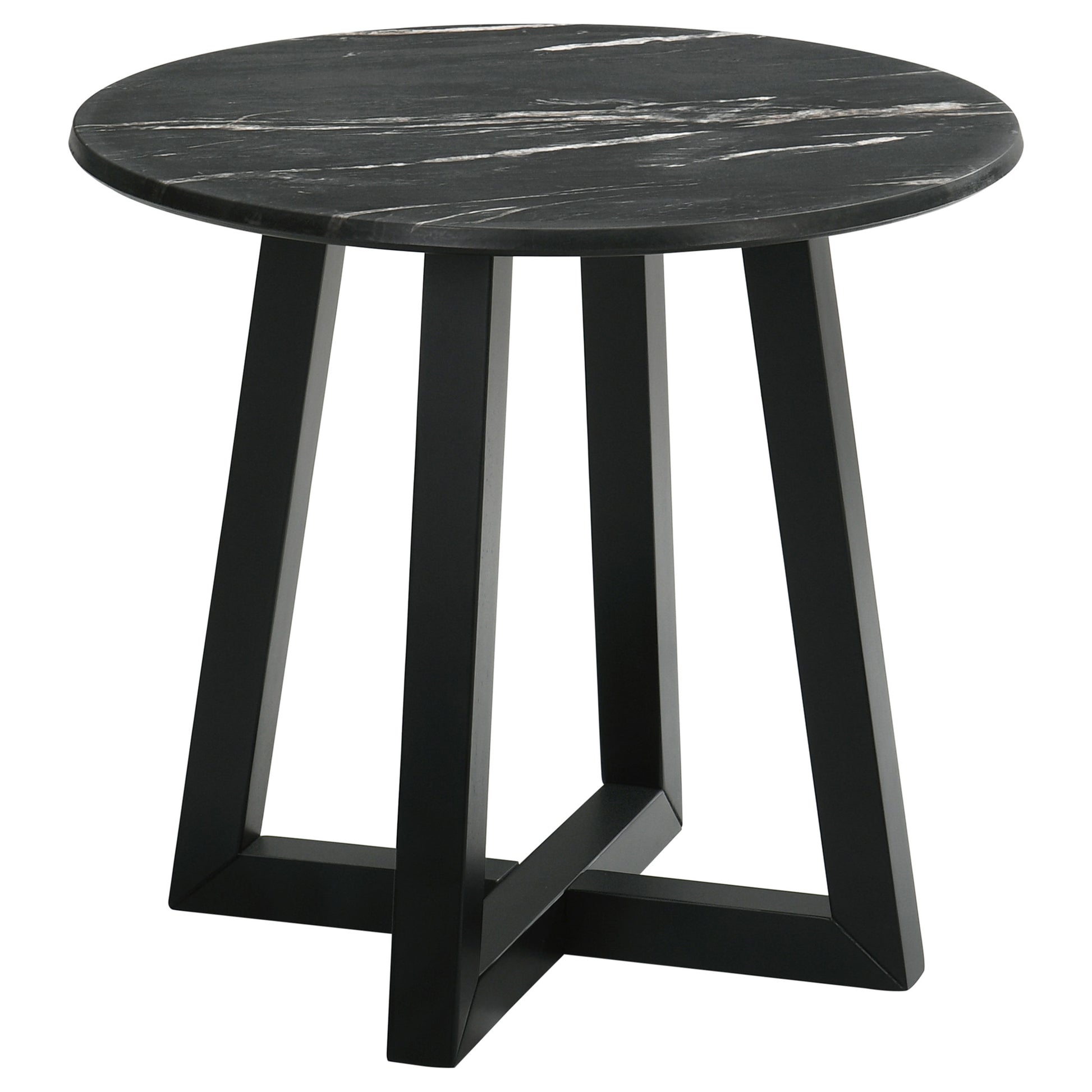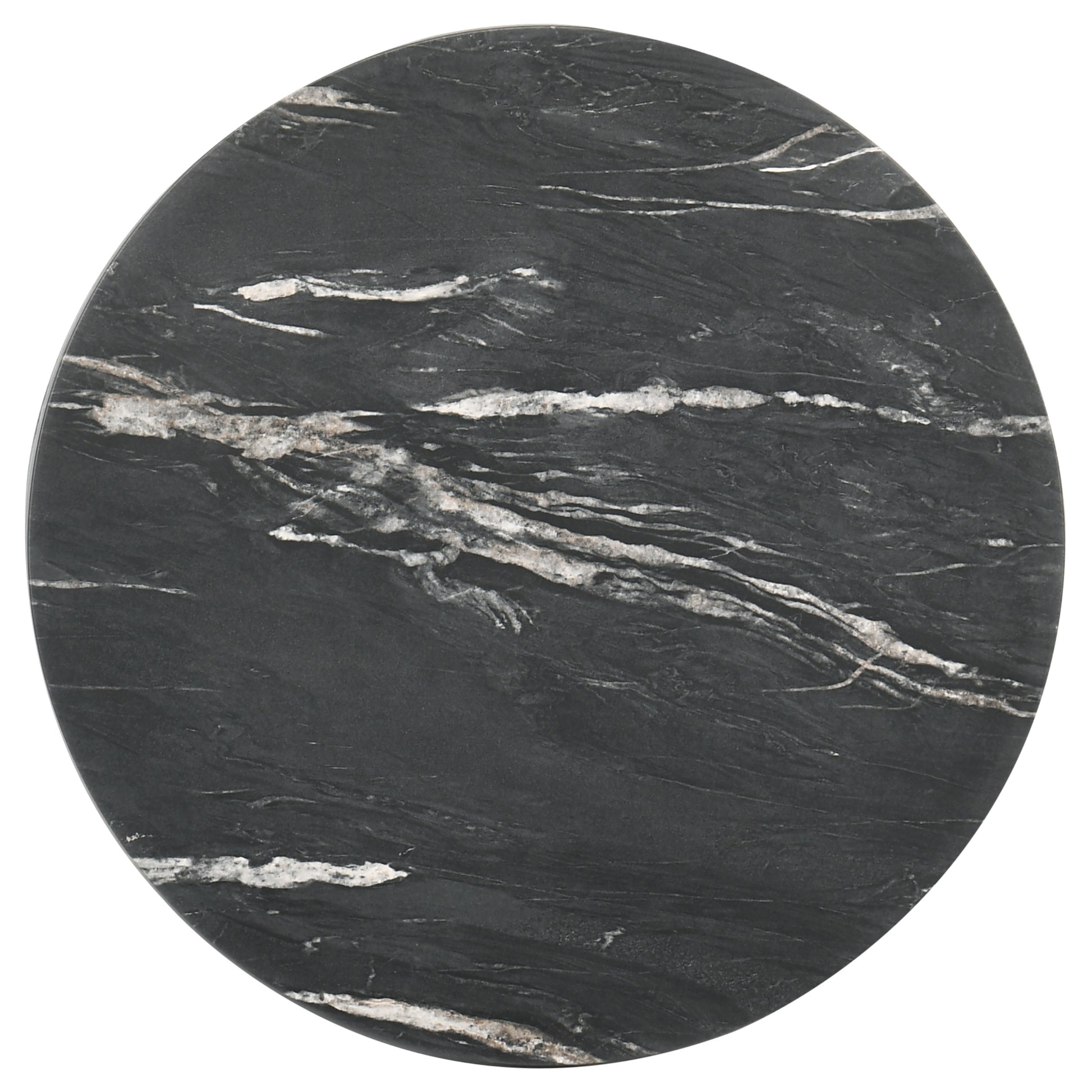 Gracefully poised, the round end table is a modern muse clad in black faux marble, a high-pressure laminate that promises enduring strength and effortless care. This exquisite tabletop, impervious to the whims of daily life, offers the opulent look of marble without its demanding nature, making luxury more accessible and relaxed. Resting on a solid wood base, the table's silhouette is a celebration of stability and elegance, with angular legs that create an intriguing visual dialogue with the smooth curves above. It's a versatile side table that elevates the art of living, turning the simple act of placing down a book or a drink into a moment of understated sophistication.