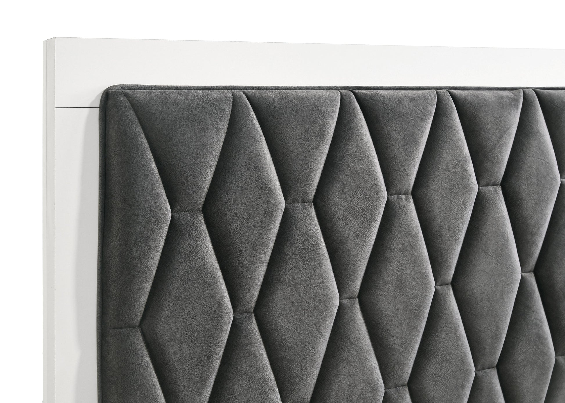 Bring geometric detail to your bedroom with the charming hexagon motif featured on this modern upholstered bed. Offering a contemporary look and feel, it creates a stylish focal point with its rich contrast of color and texture. The padded headboard offers excellent comfort and dark gray fabric upholstery. A streamlined wood frame adds a bright white finish to the rectangular head and footboards, creating an open, airy look. This stylish bed is complete with black accents in the base of the footboard and requires a foundation for use.