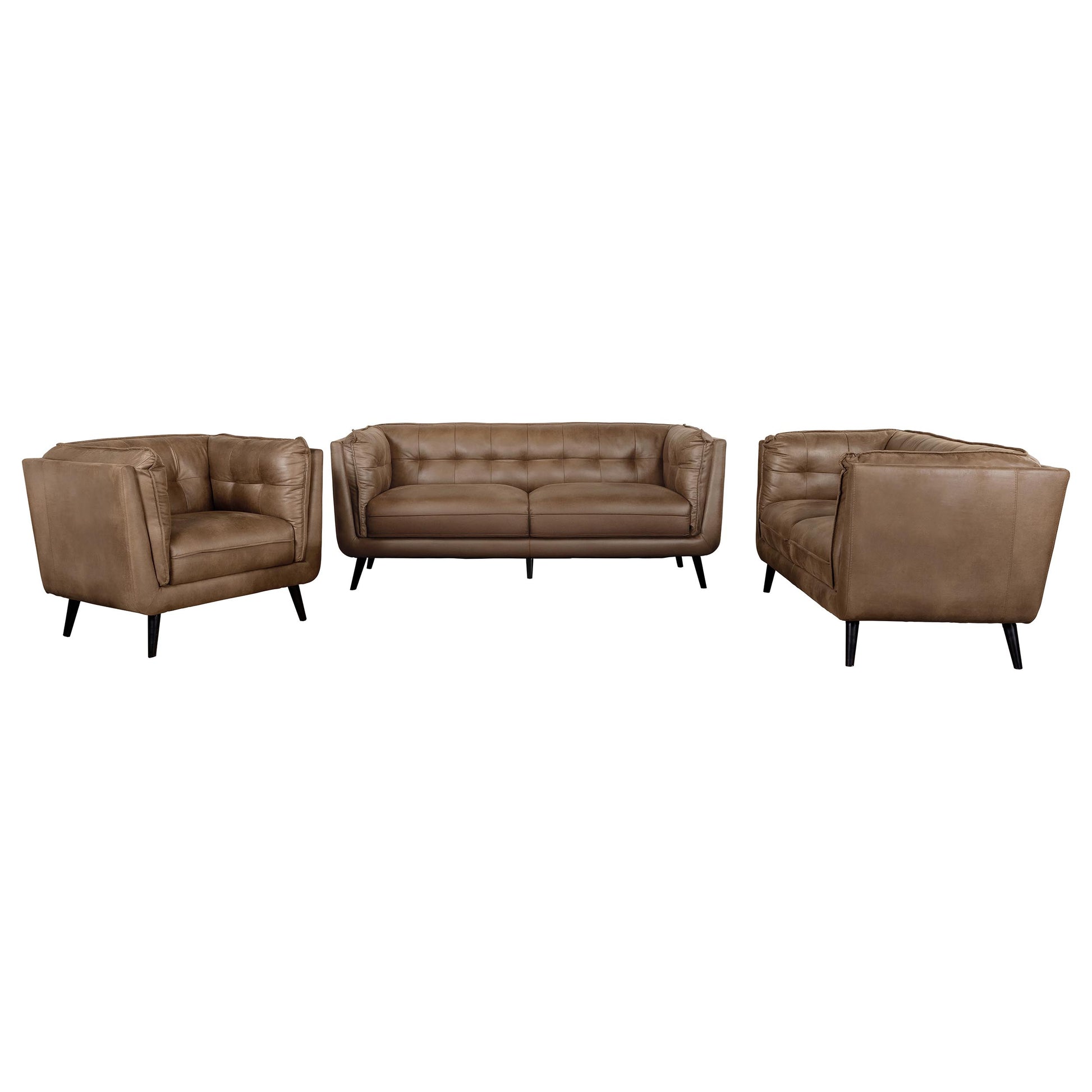 Host guests in your contemporary living room with this mid-century modern shelter style seating set, featuring plush grid tufted backrests and cushions upholstered in a soft brown performance coated microfiber for supreme comfort. This retro-inspired contemporary upholstered living room collection presents classic Chesterfield style frames, accented with wet trim details and flared tapered dark brown wood legs for a chic vintage vibe.