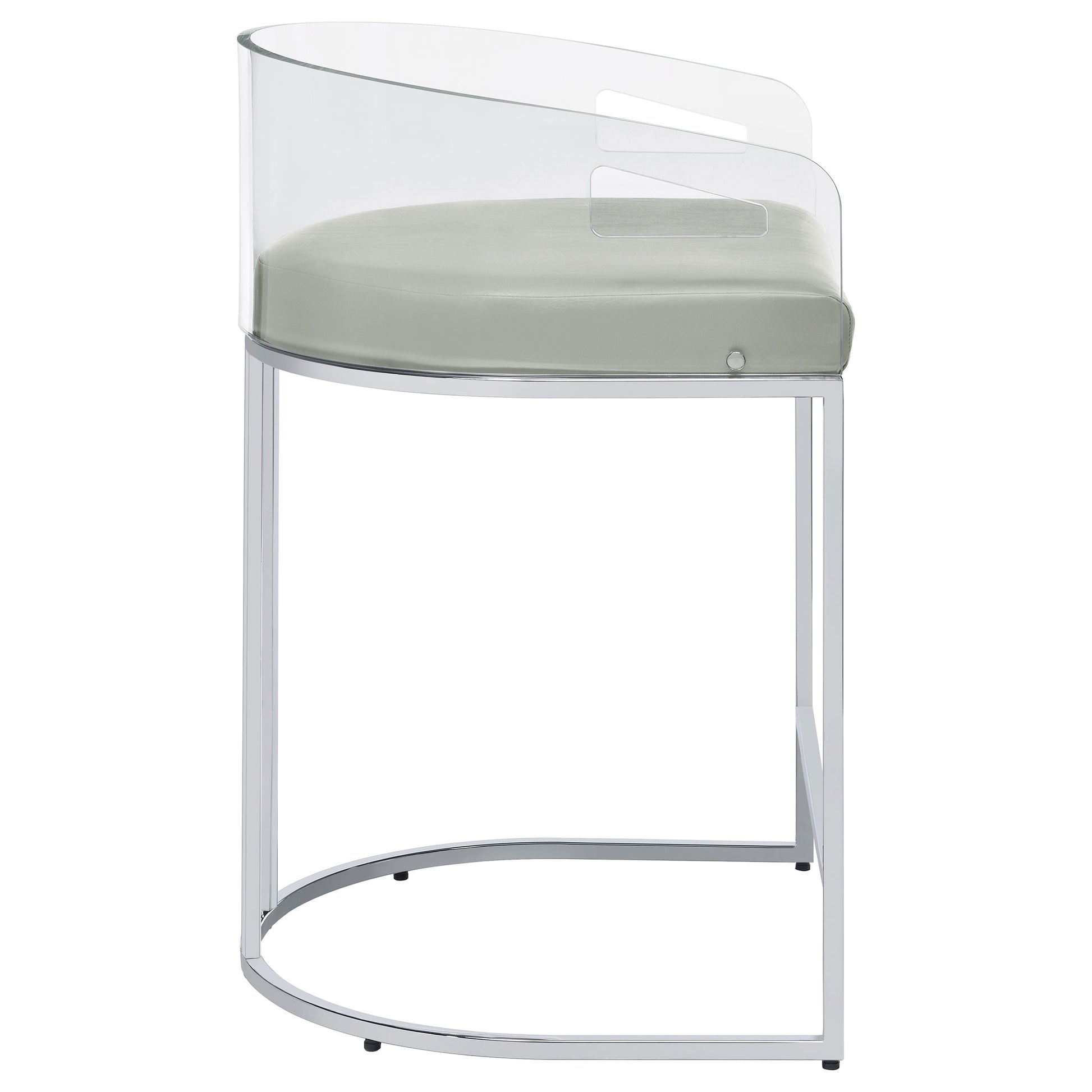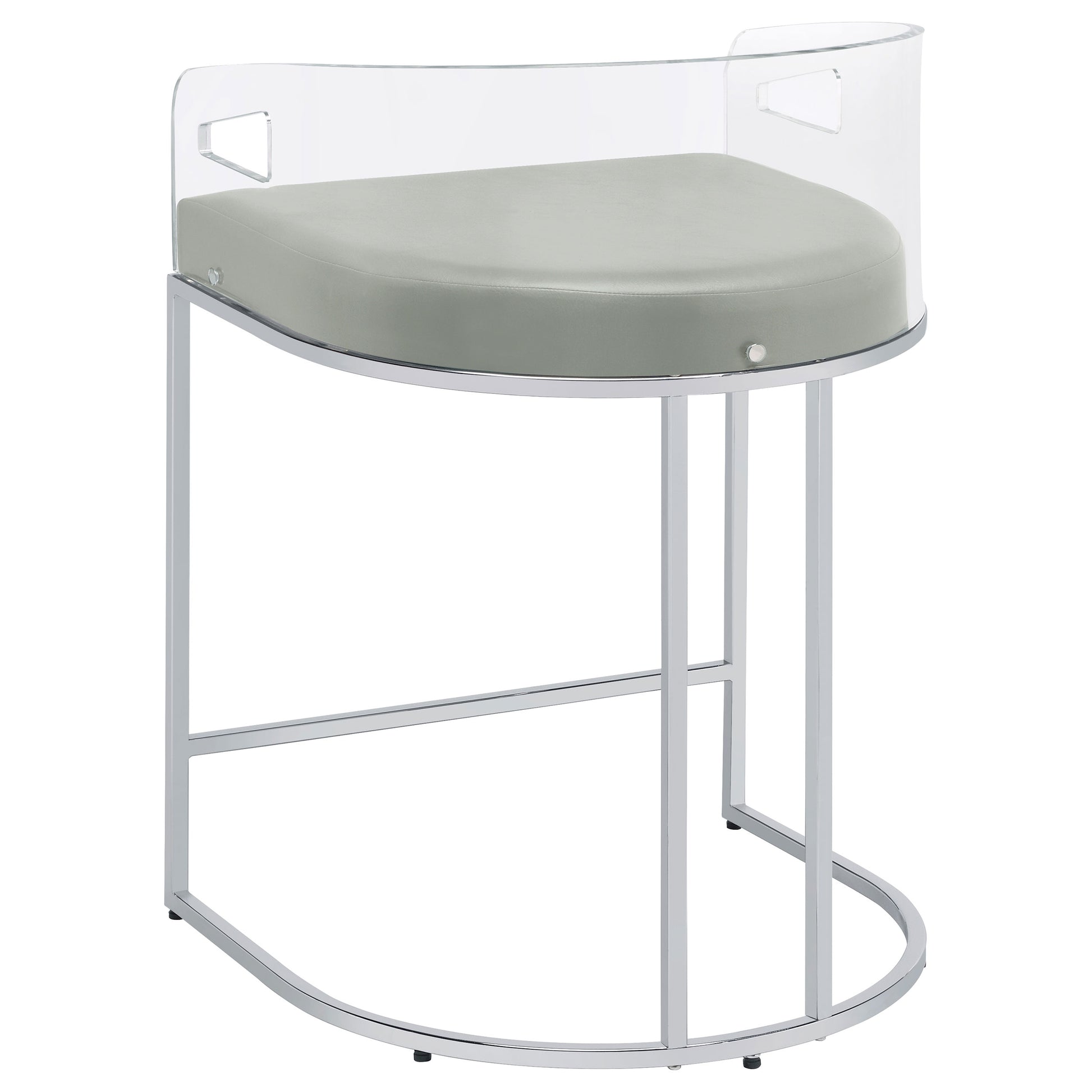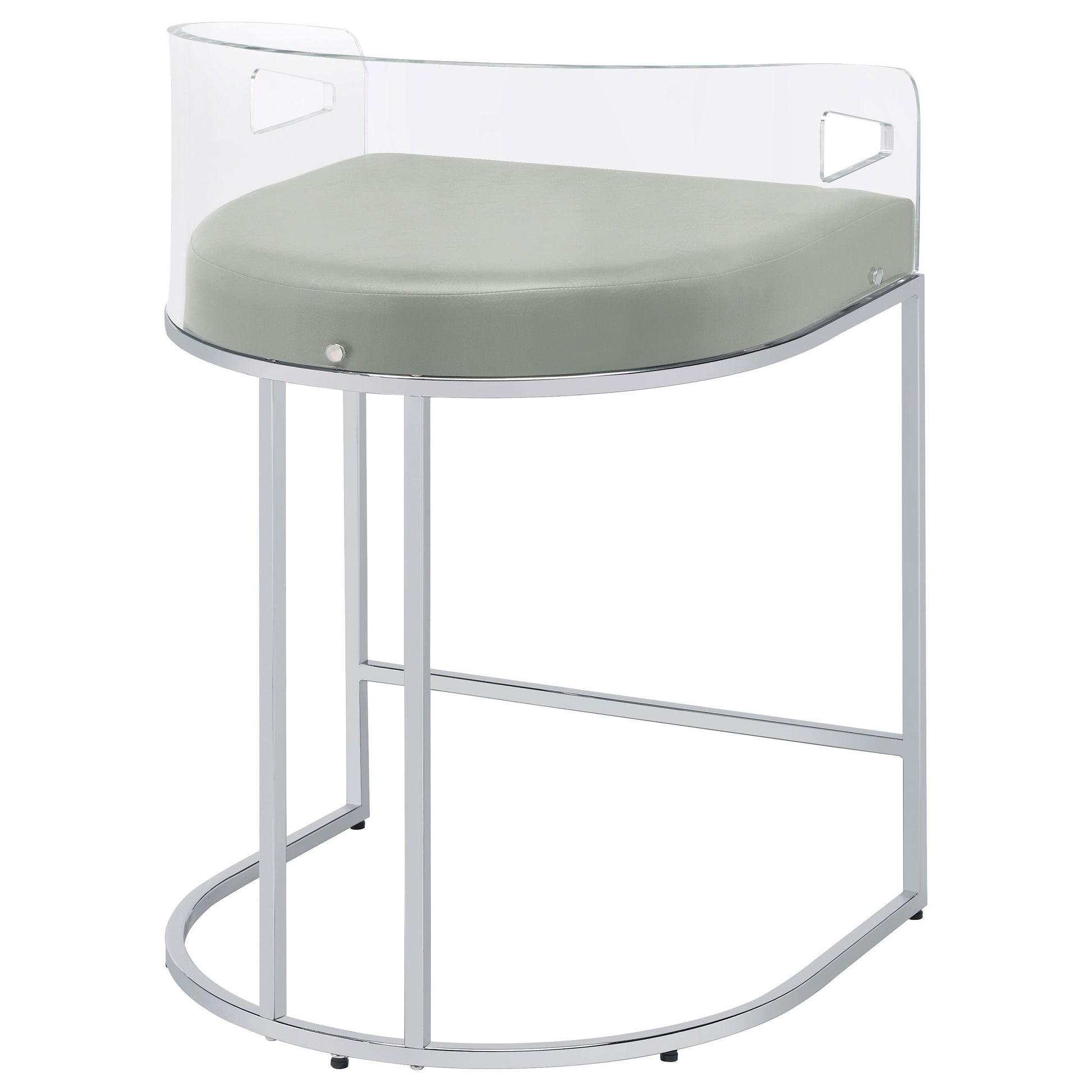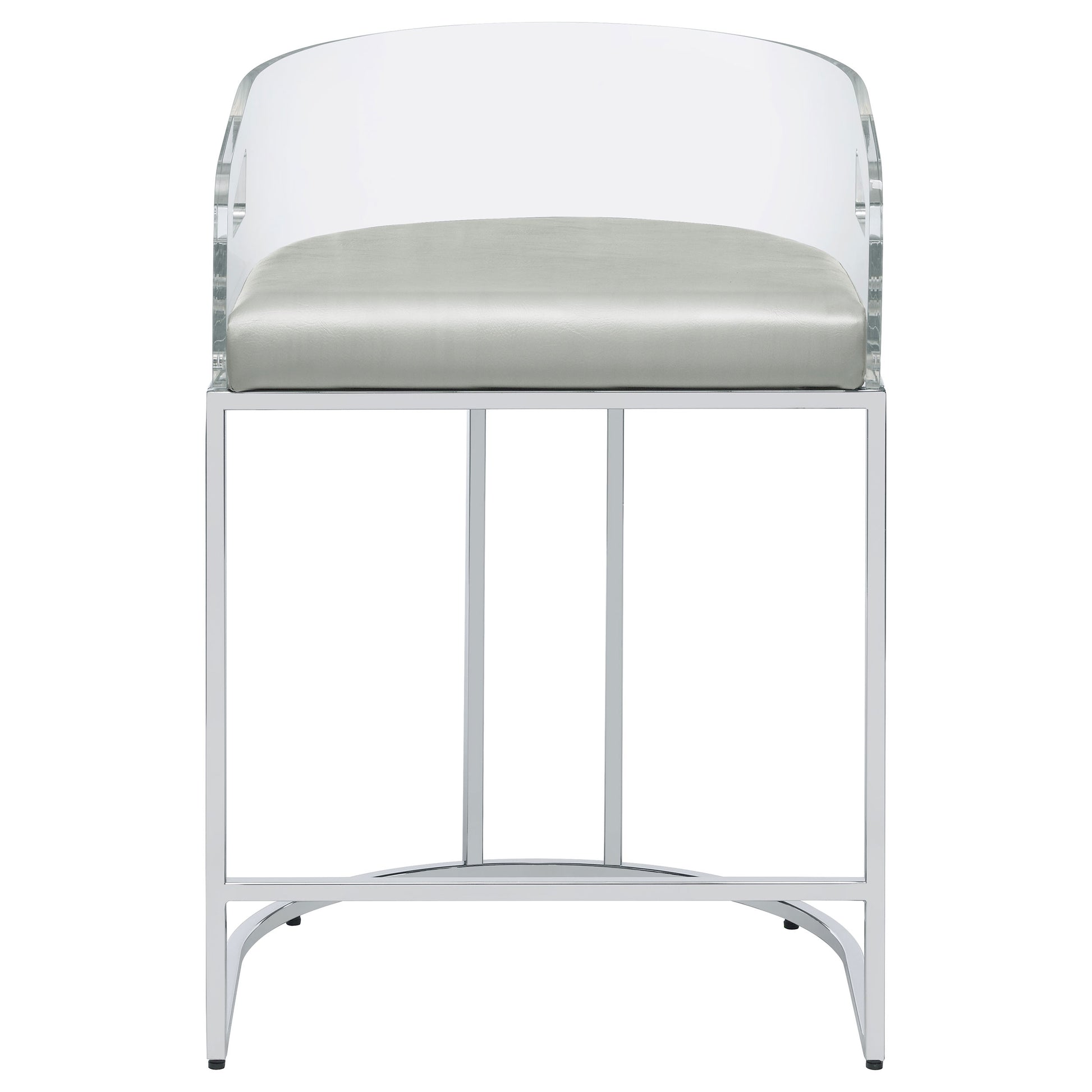 Ultra-modern with a retro-inspired vibe, this pair of stools make a striking piece to a dining room space. With a curved backrest in a clear acrylic material, each stool offers an open and airy design. Rest comfortably on a leatherette cushion as you dine or sip a cocktail. In addition, each stool is supported by a slim metal legs in a lustrous chrome finish and a base shape that mimics the rounded acrylic backrest. Pull up a pair of these stools to a kitchen bar or complete a compact home bar.