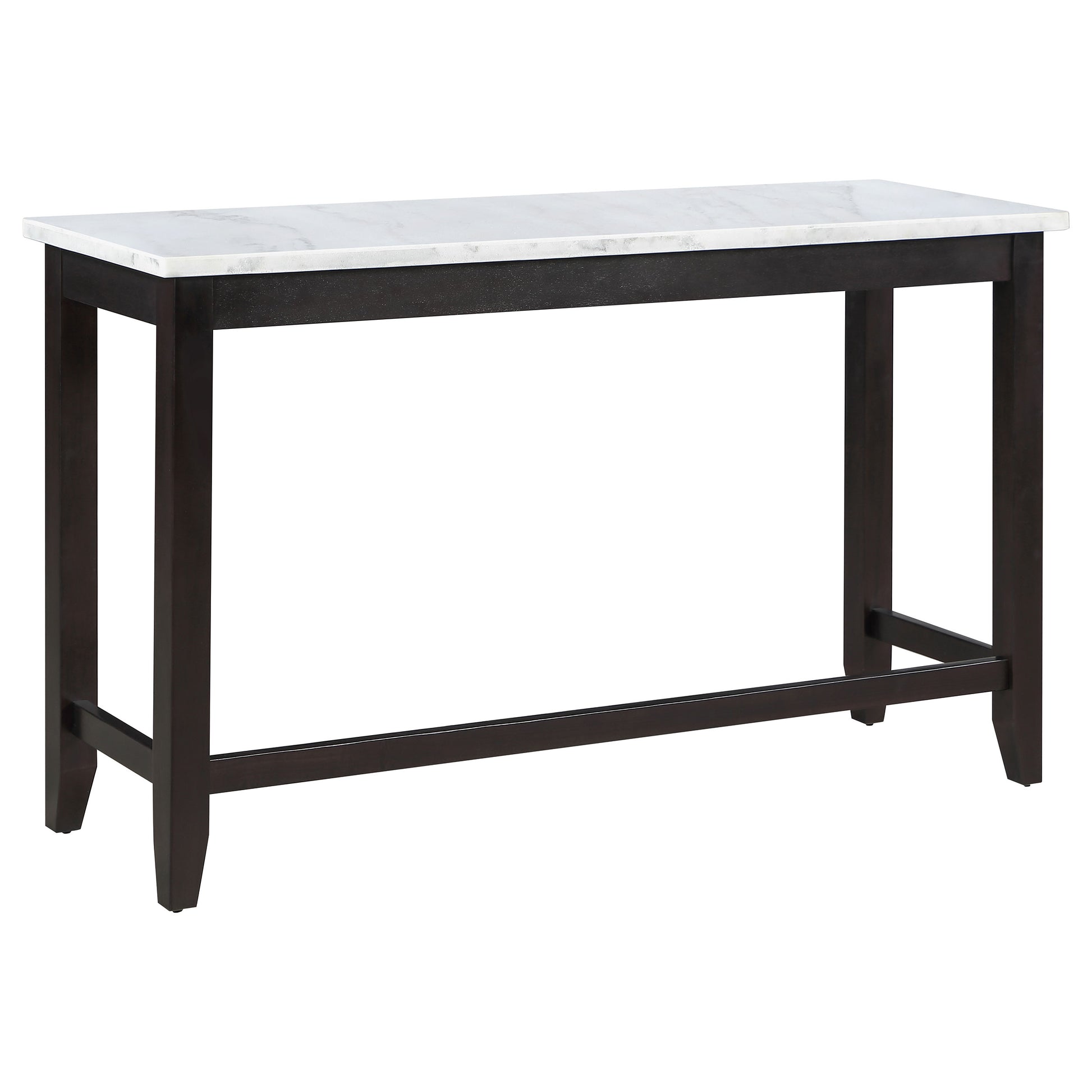 Create a breakfast bar in your kitchen nook with this modern counter height table. Designed with a striking color combination, a rustic espresso trestle base lends a dramatic touch and grounds the room elegantly. Gather friends and family around the long white marble top and bring in coordinating counter stool of your choosing. Thick, straight legs elevate the counter height top, allowing you to slide stools or chairs beneath when not in use. A wonderful addition for sophisticated dining experiences, brunches, and beyond.