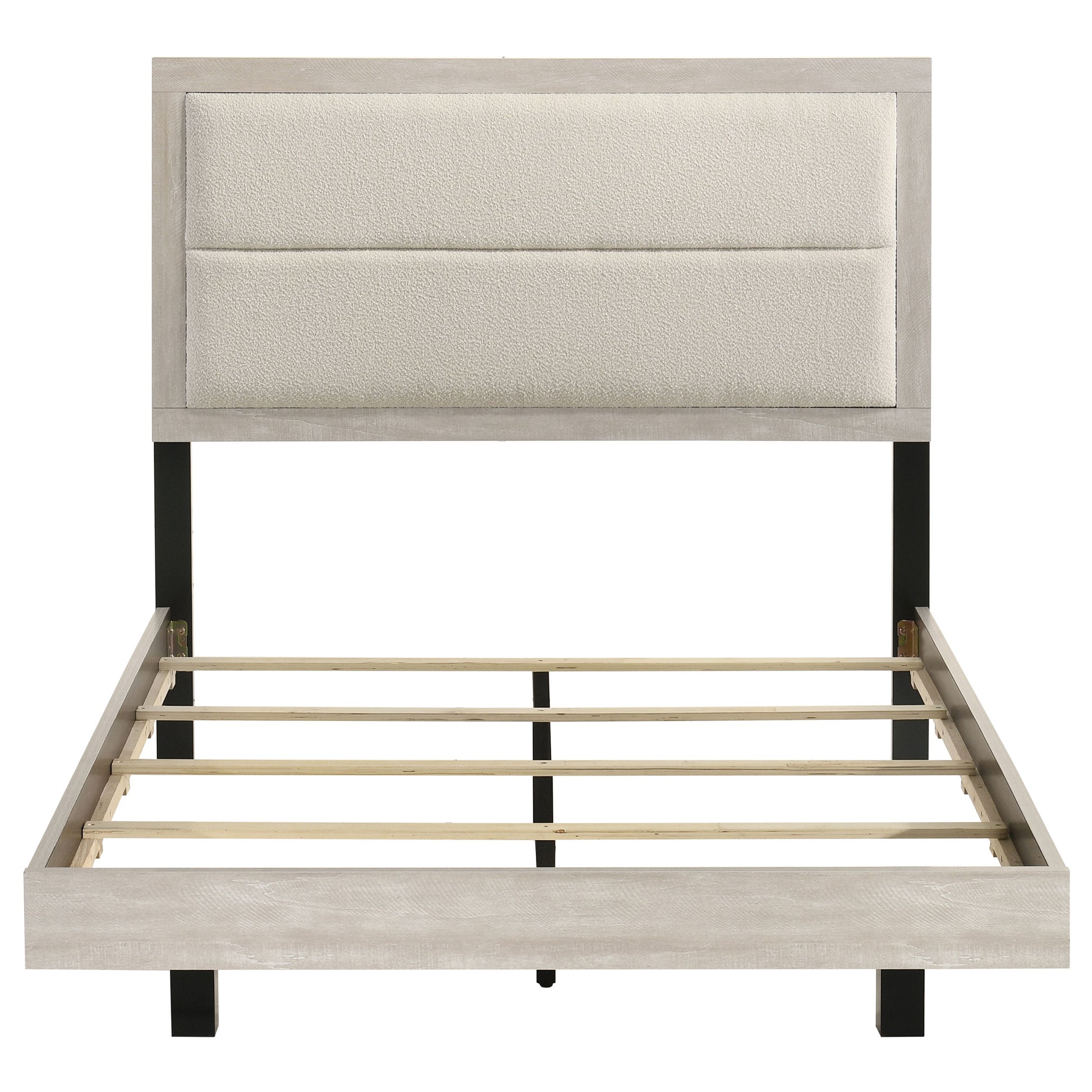 This contemporary bed is the perfect fusion of style and comfort, designed to bring a cool, modern vibe to any bedroom. With its unique "floating" effect, it creates a sense of spaciousness and sophistication. The headboard is upholstered in a soft, cream bouclé fabric, adding a touch of texture and warmth that complements the bed's rustic cream finish. Crafted from rubberwood and engineered wood with a rough-sawn, white-washed engineered paper veneer, this bed showcases a Yin & Yang contrast between rustic and refined design elements.