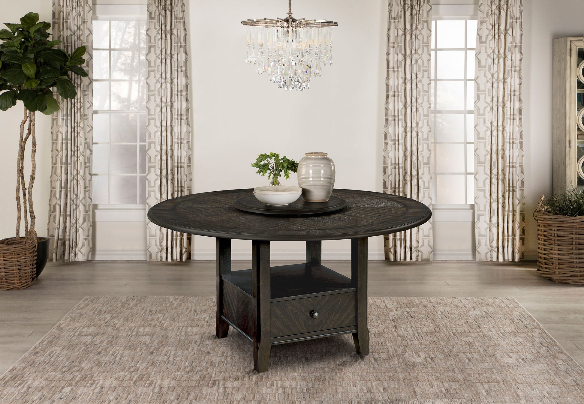 Elevate your dining room into a more formal gathering space with this transitional dining table. Designed with a spacious round tabletop, complete with a 24-inch removable lazy susan, this elegant furniture piece lends itself wonderfully to traditional and more modern homes. Made in a dark cocoa finish that boasts a bold dark hue, the 60-inch round top rests on a pedestal base that offers up a drawer for storing dining essentials. The open bottom shelf above invites you to showcase decor. And with its expansive round top, this dining table seats six family members or guests quite comfortably.