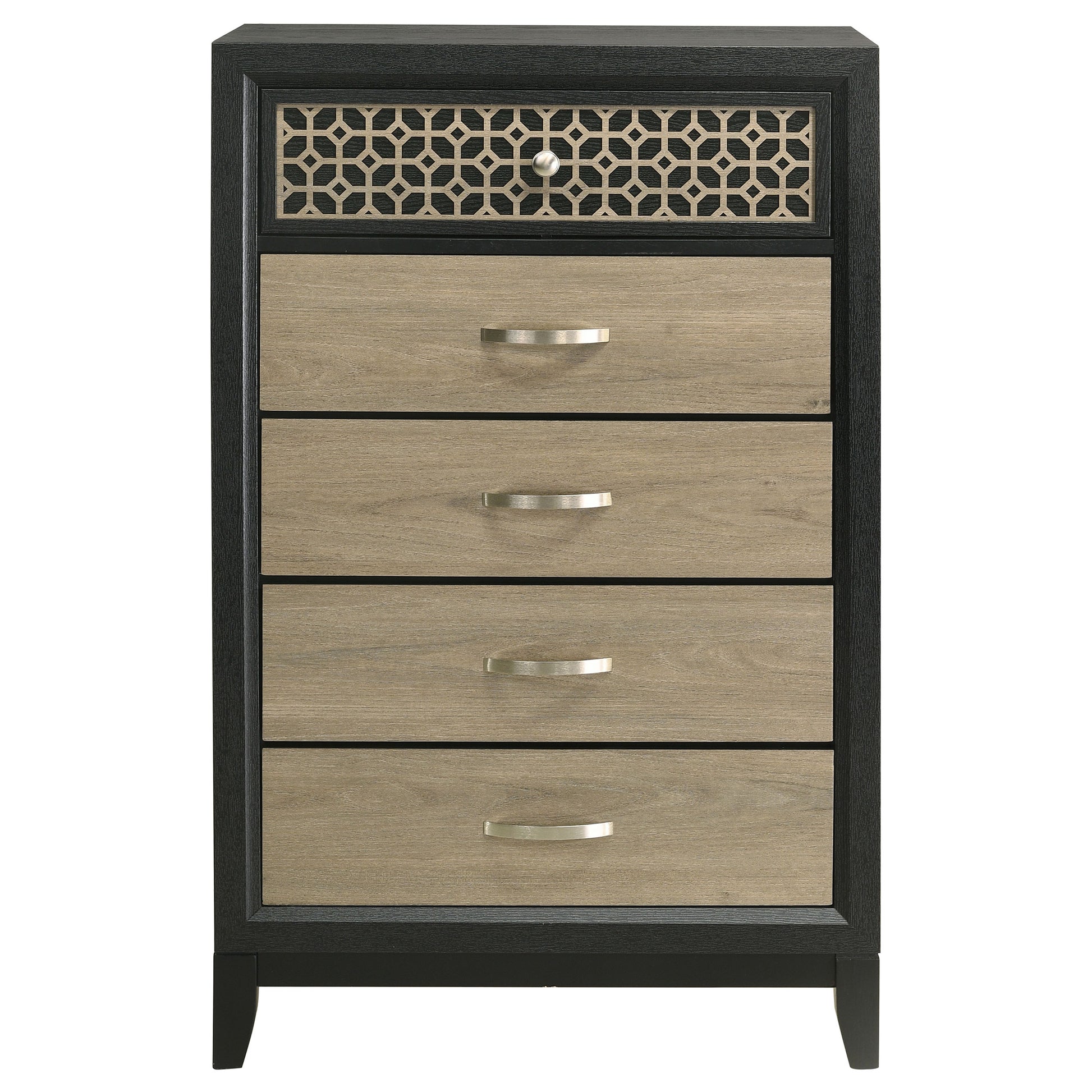 Attention to detail sharpens the decadent look of your modern or transitional master or guest bedroom suite. This artisan-inspired five-drawer chest creates an exceptional look with tasteful and attractive detail. Wood and wood products construction offers a sturdy feel in a chest with a versatile finish duo of black and light brown. Decadent cutout trim on its upper drawer embellishes an already chic look with a tempting geometric pattern. Metal drawer hardware accompanies English dovetail construction and easy opening on Kenlin glides.