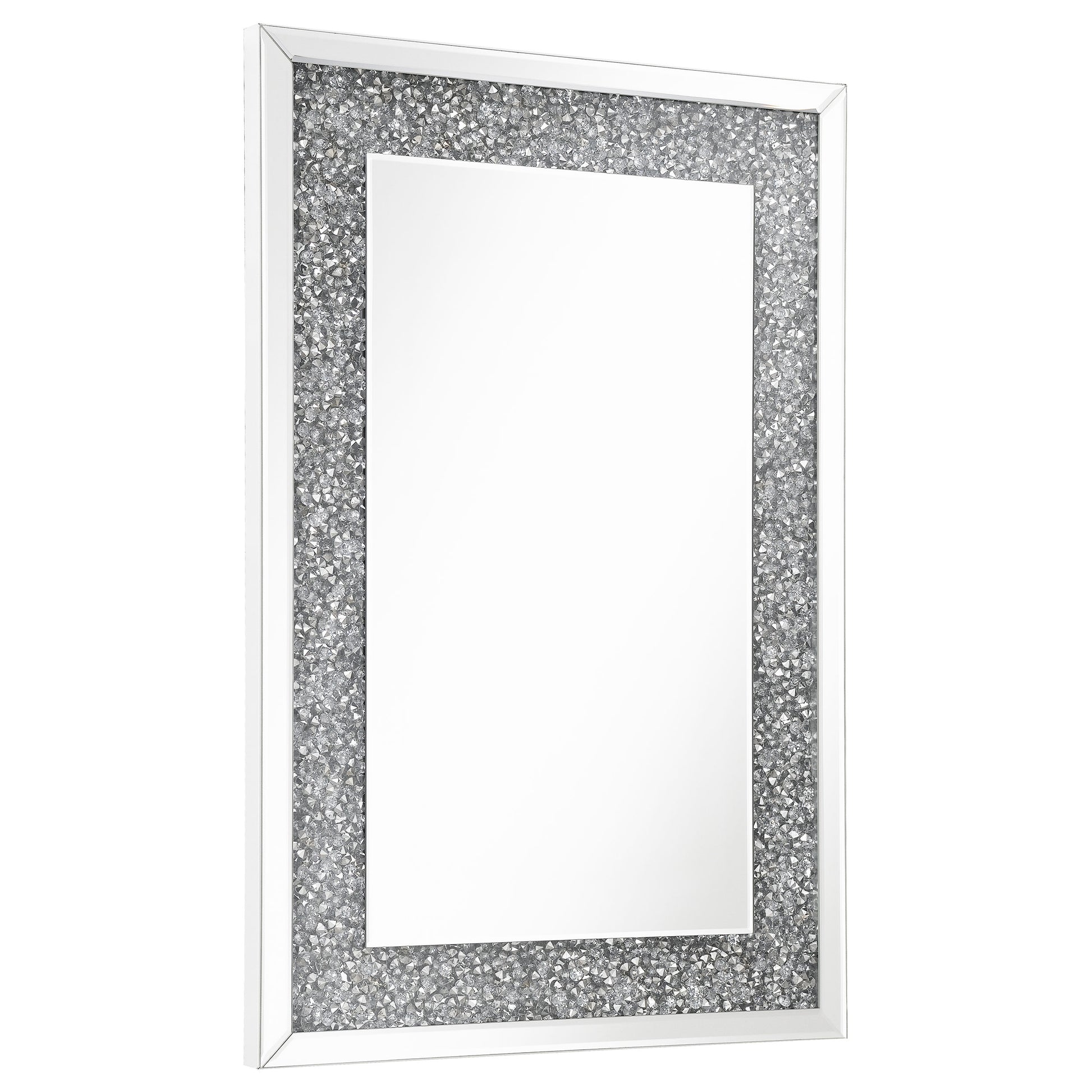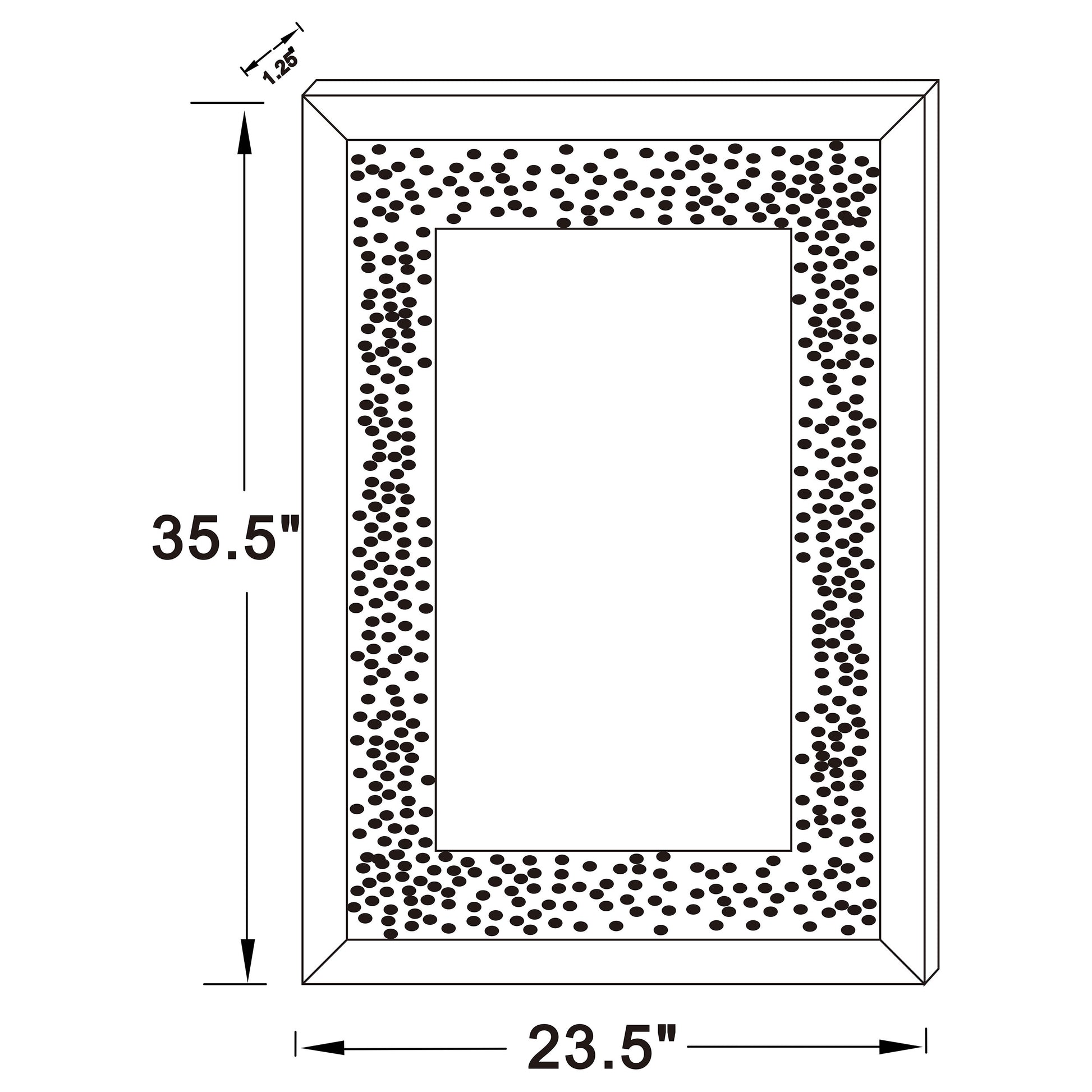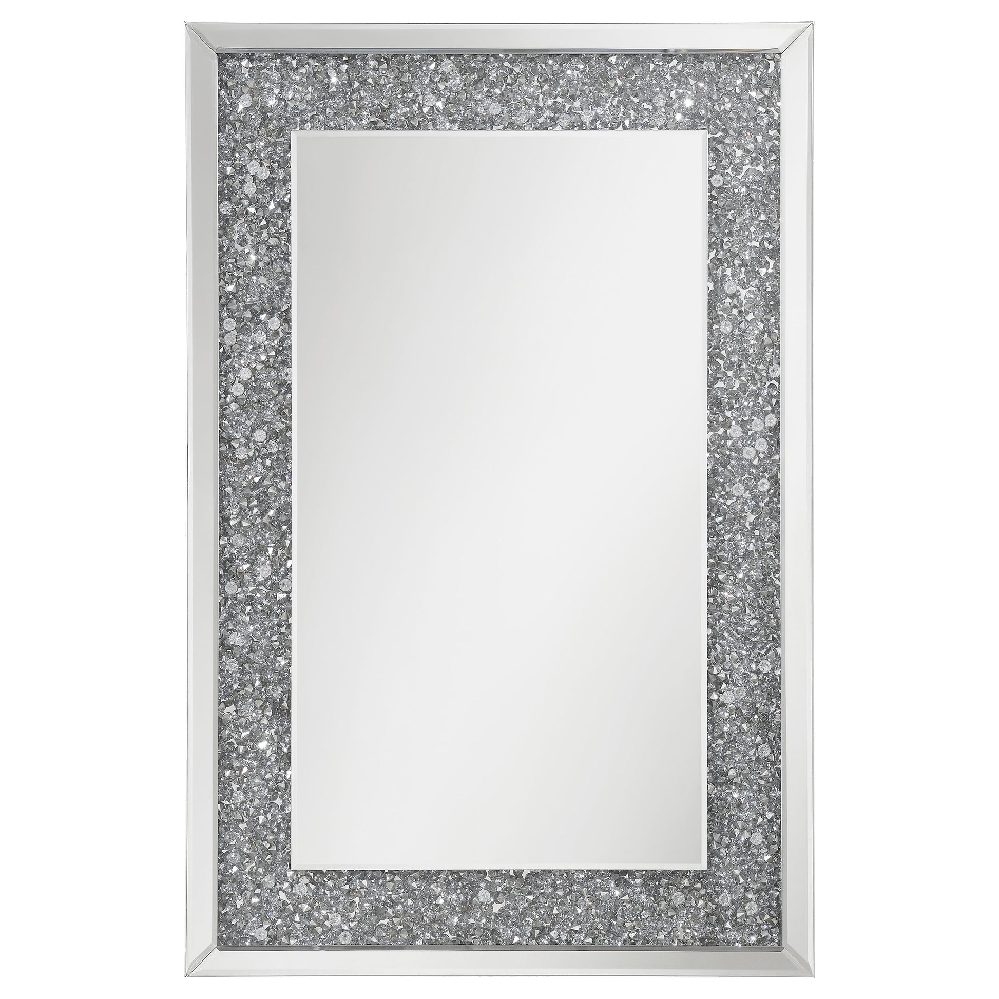 Elevate dressing areas, entryways, and bathroom spaces with this elegant modern glam wall mirror. A mirror tile frame surrounds the edges, offering a majestic and highly reflective surface. Silver crushed acrylic is encrusted in the interior paneling, offering an organic, eye-catching texture and breathtaking sparkle. The rectangular design offers a tall, vertical mount, perfect for narrow spaces and compact vanity walls. Mount this stylish, chic wall mirror in your bedroom space for a luxurious dressing area setup.