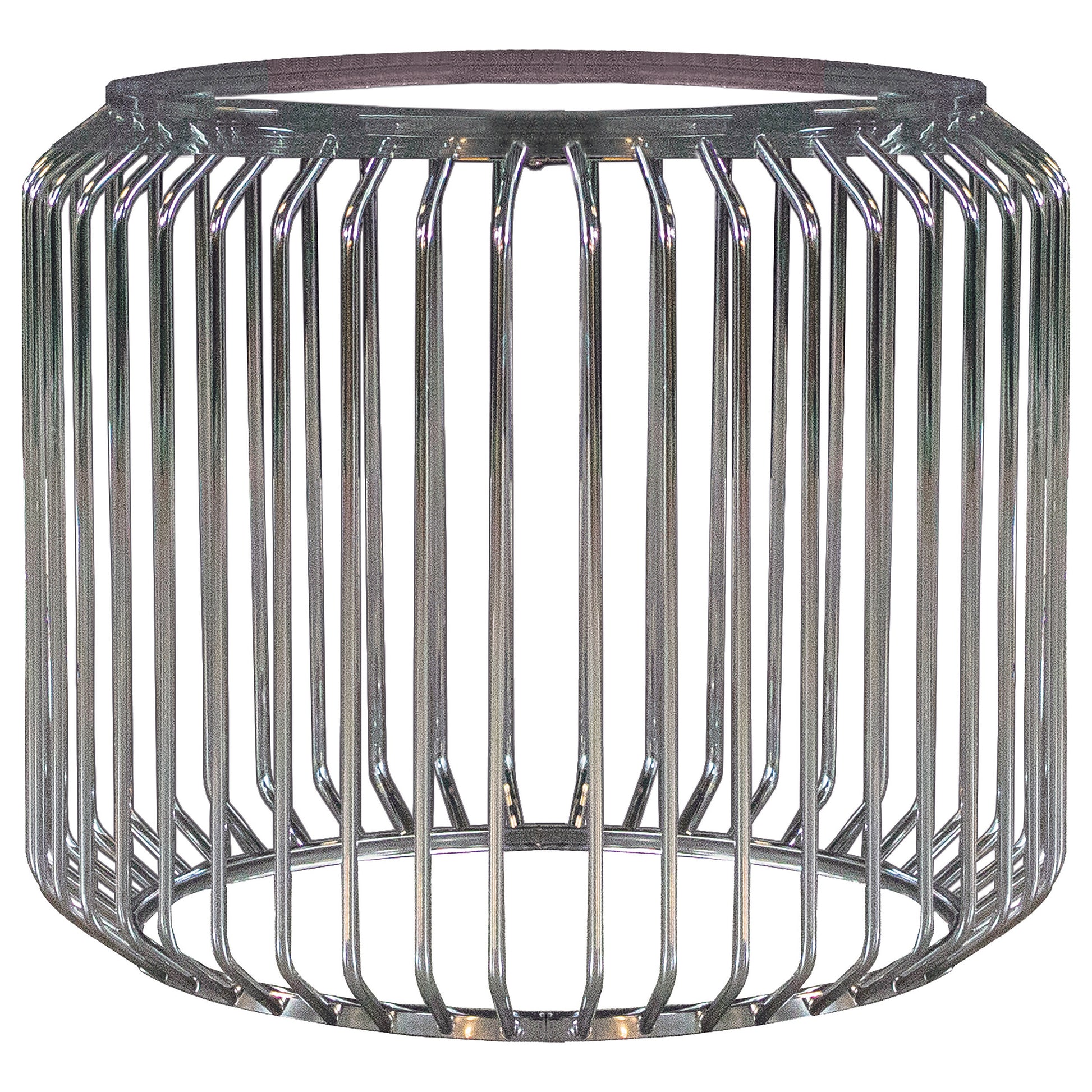 With a chic Art Deco vibe and retro-inspired flair, comes this modern dining table base. Featuring a cylindrical shape surrounded by slim metal rods all around, this dining table base gives off a cage-like appearance and an open and airy style. With a lustrous polished chrome finish throughout, it opens itself up to existing color palettes, allowing you to play with tablescapes and seating as you wish. Versatile and convenient, this sturdy metal base allows you to top whatever size or shape tabletop you desire in the space. Make it a dramatically bold, wide end table or an oversized round dining table suitable for multiple guests.