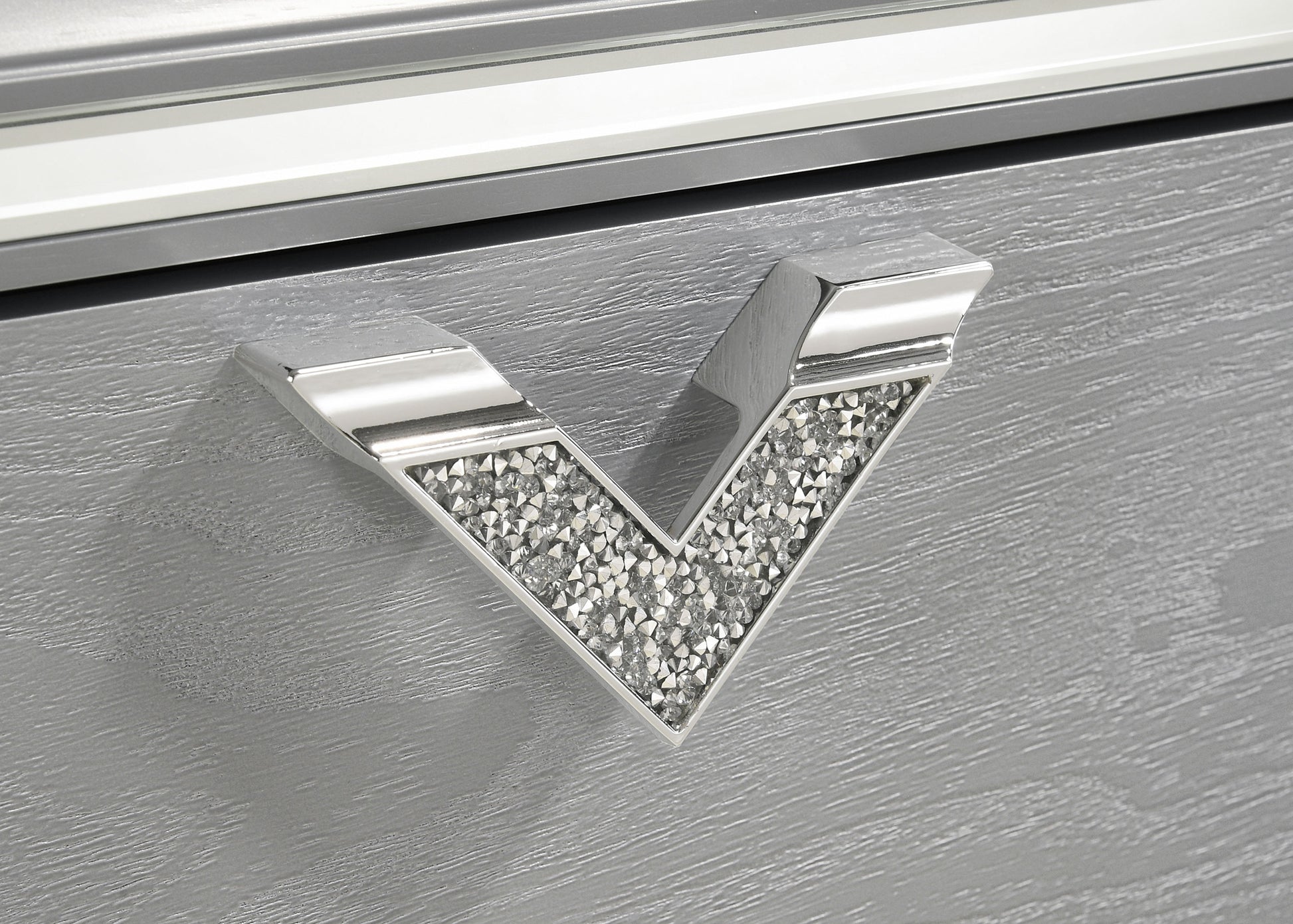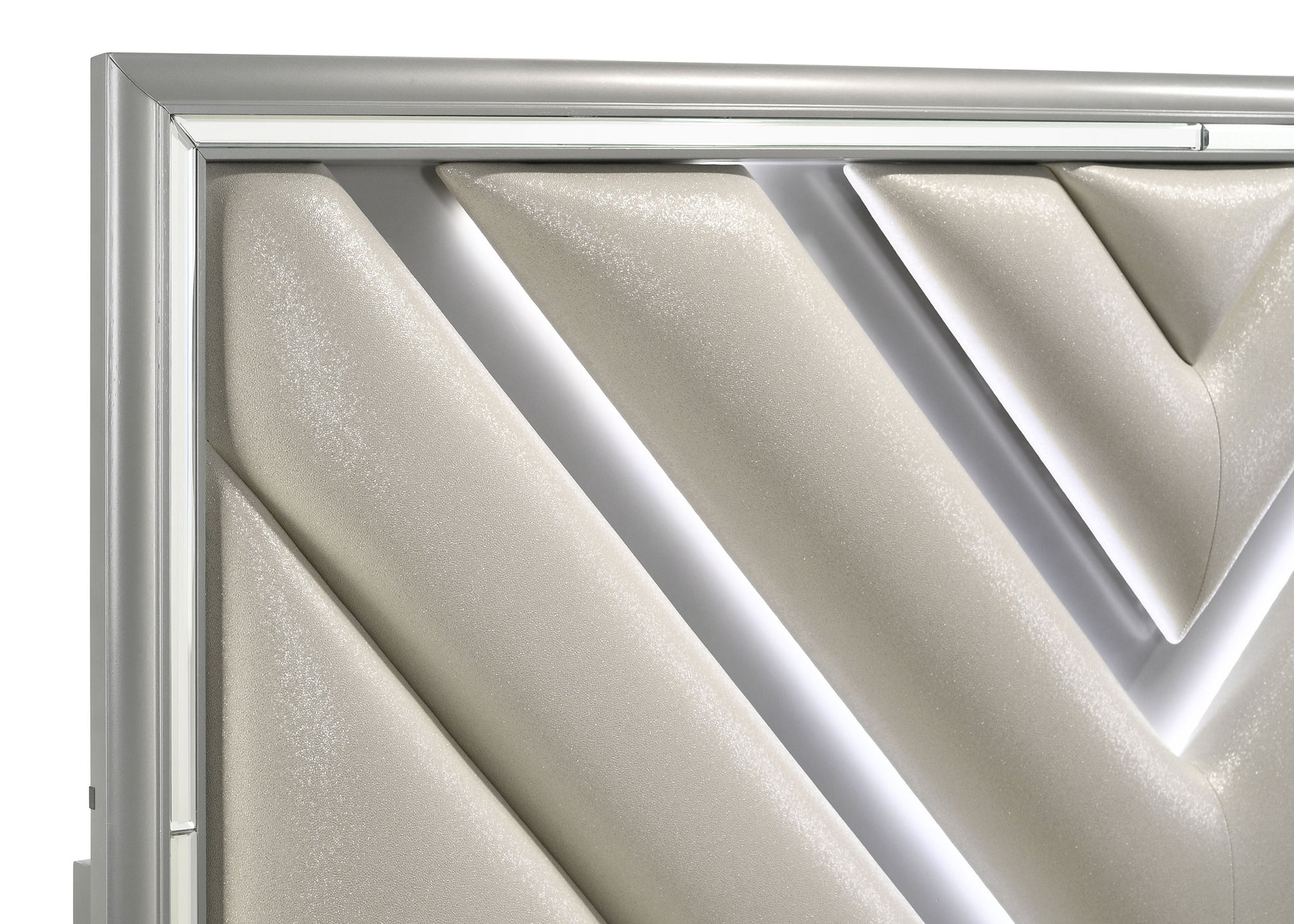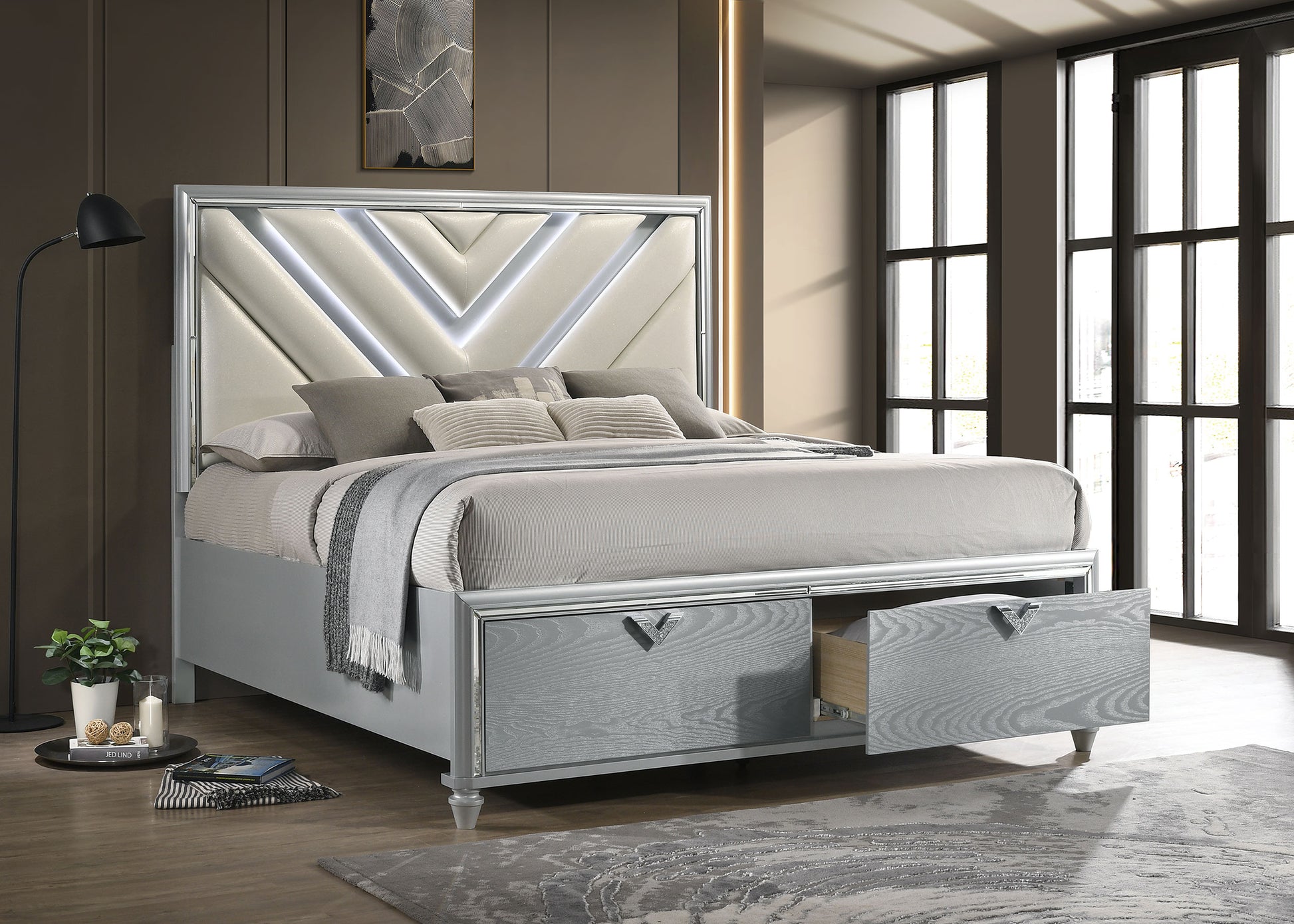 A plush padded headboard is augmented with LED lighting to bring modern allure to a chic, contemporary storage bed. Designed with two drawers in the footboard, the bed offers a glamorous vibe that keeps functionality at the forefront. The headboard features plush snow white fabric with padding and a chevron design details that adds a sense of movement and flow. LED lighting traces the chevron details, offers cool white blue illumination that creates a stylish ambiance for lounging and relaxing. The bed is complete with a light silver wood grain finish and includes jeweled chevon drawer pulls that add the perfect decorative finishing touch.