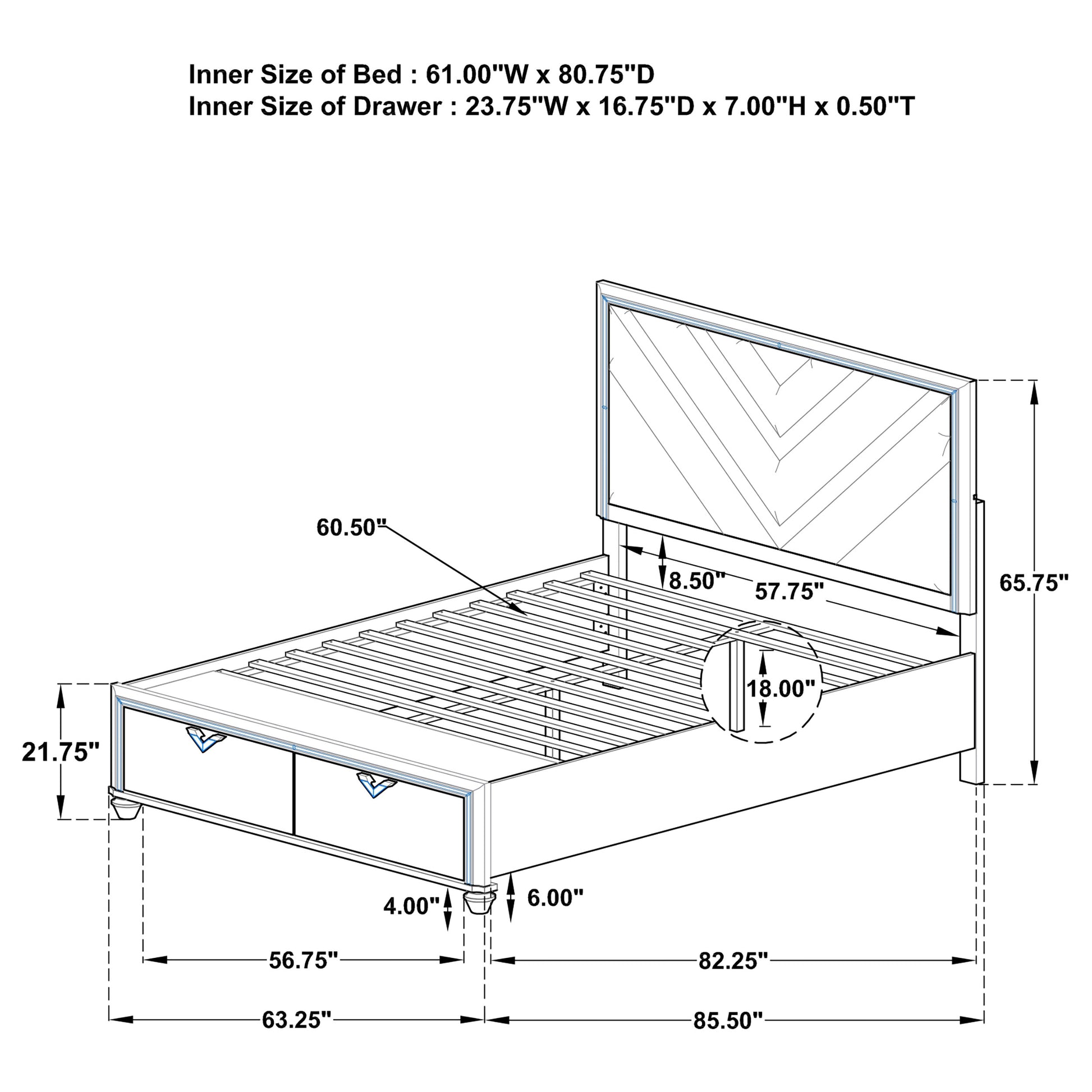 | Queen Storage Bed | 63.5 | 85.75 | 66 | 209.69 |