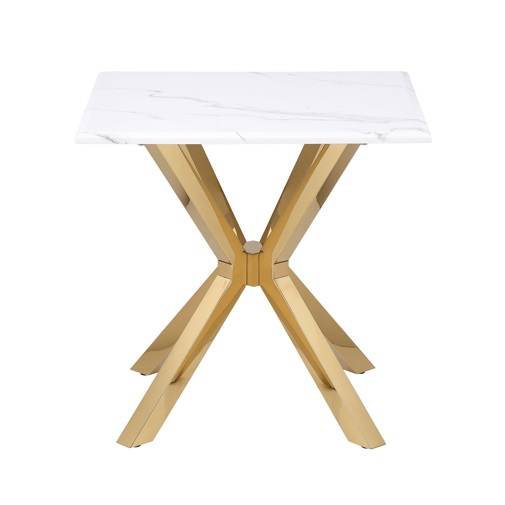 Bring elegance to your living space with this modern square end table, featuring a white faux marble top with realistic veining for a touch of sophistication. Its sturdy, rust-proof base is crafted from stainless steel in a star-shaped design, finished with a radiant gold coating achieved through Particle Vapor Deposition (PVD). Perfect for decor, lamps, or essentials, this stylish table blends luxurious aesthetics with practical functionality, making it a standout addition to any modern interior.