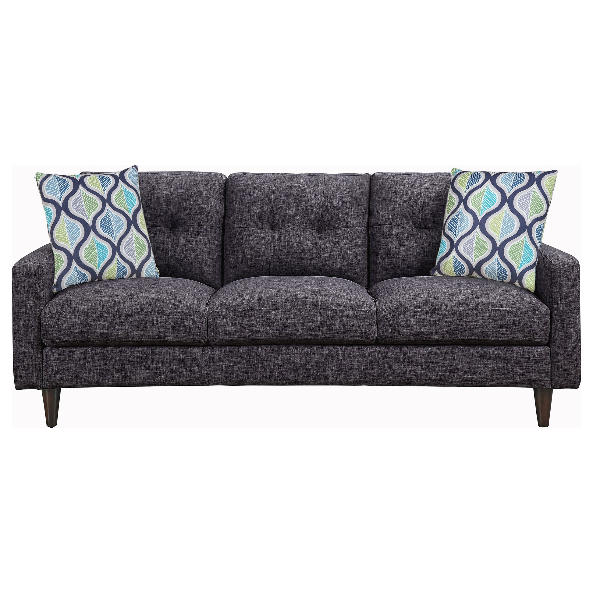 Add a retro twist to a living room with this two-piece living set. With delicate tufting on the back cushions, this sofa is structured and elegant. Upholstered in grey fabric, the smooth cushions add a sleek feel. Elongated and tapered, the warm legs create a mid-century modern-inspired look. Enjoy a movie or conversation on the refined cushions of the sofa or loveseat.
