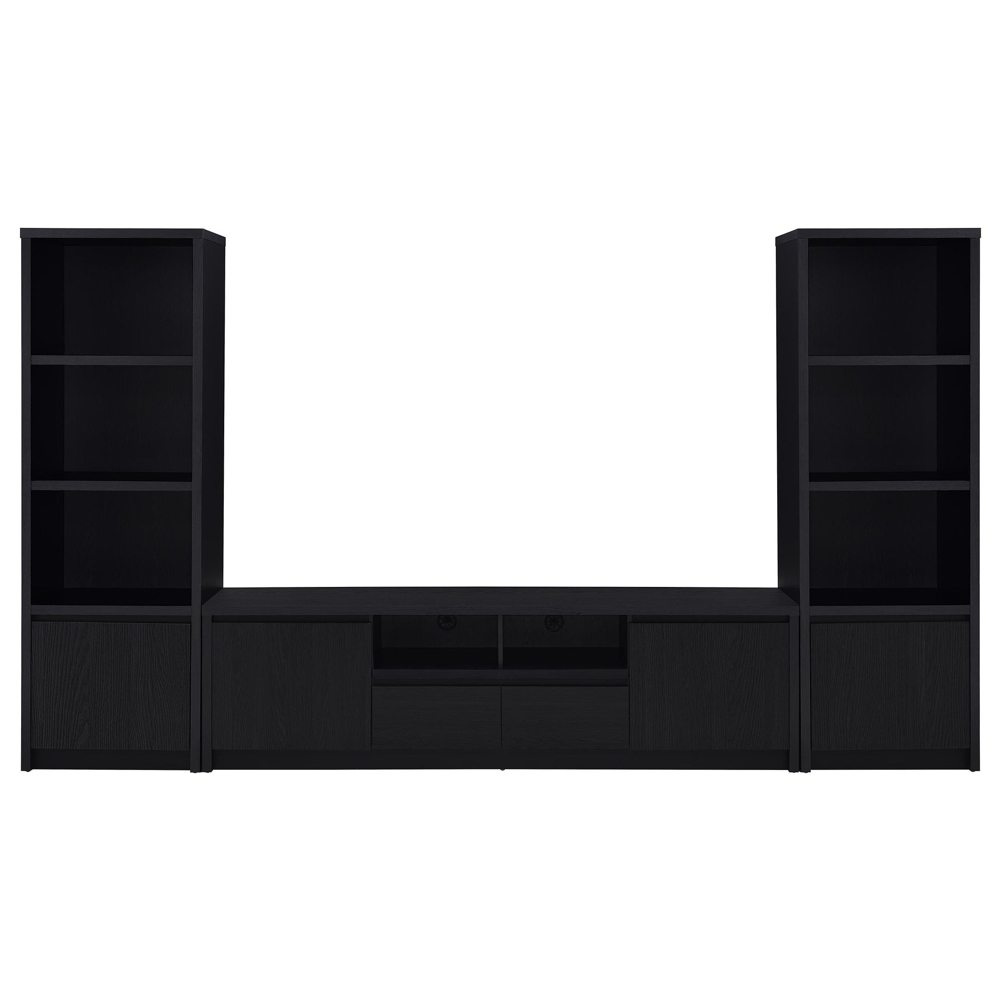 This sleek entertainment center combines a contemporary black finish with practical storage solutions. Made from durable engineered wood, it’s topped with a scratch-resistant eco-friendly laminate veneer. The unit includes two cabinets for concealed storage, an open shelf with a cable management hole for media devices, and a spacious drawer for organization. Its sturdy construction and modern silhouette make it a versatile piece for any entertainment setup.