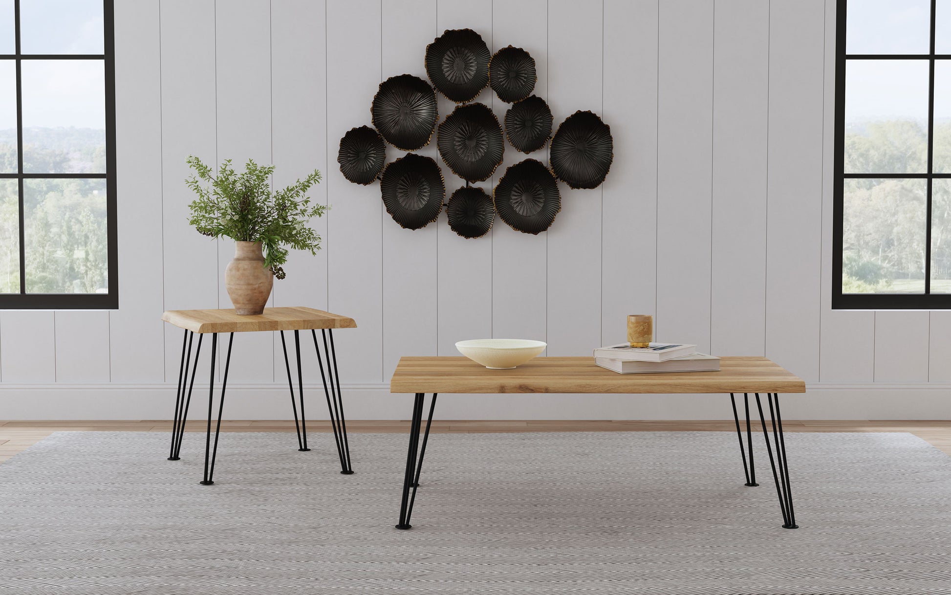 This coffee table set combines rustic charm with industrial modern aesthetics. Each table features a solid acacia wood top with a natural finish, highlighting unique grain patterns. Supported by solid iron hairpin legs in a matte black powder-coated finish, the set offers both durability and a sleek design. Perfect for creating a cohesive look, this occasional table set brings functionality and style to living spaces.