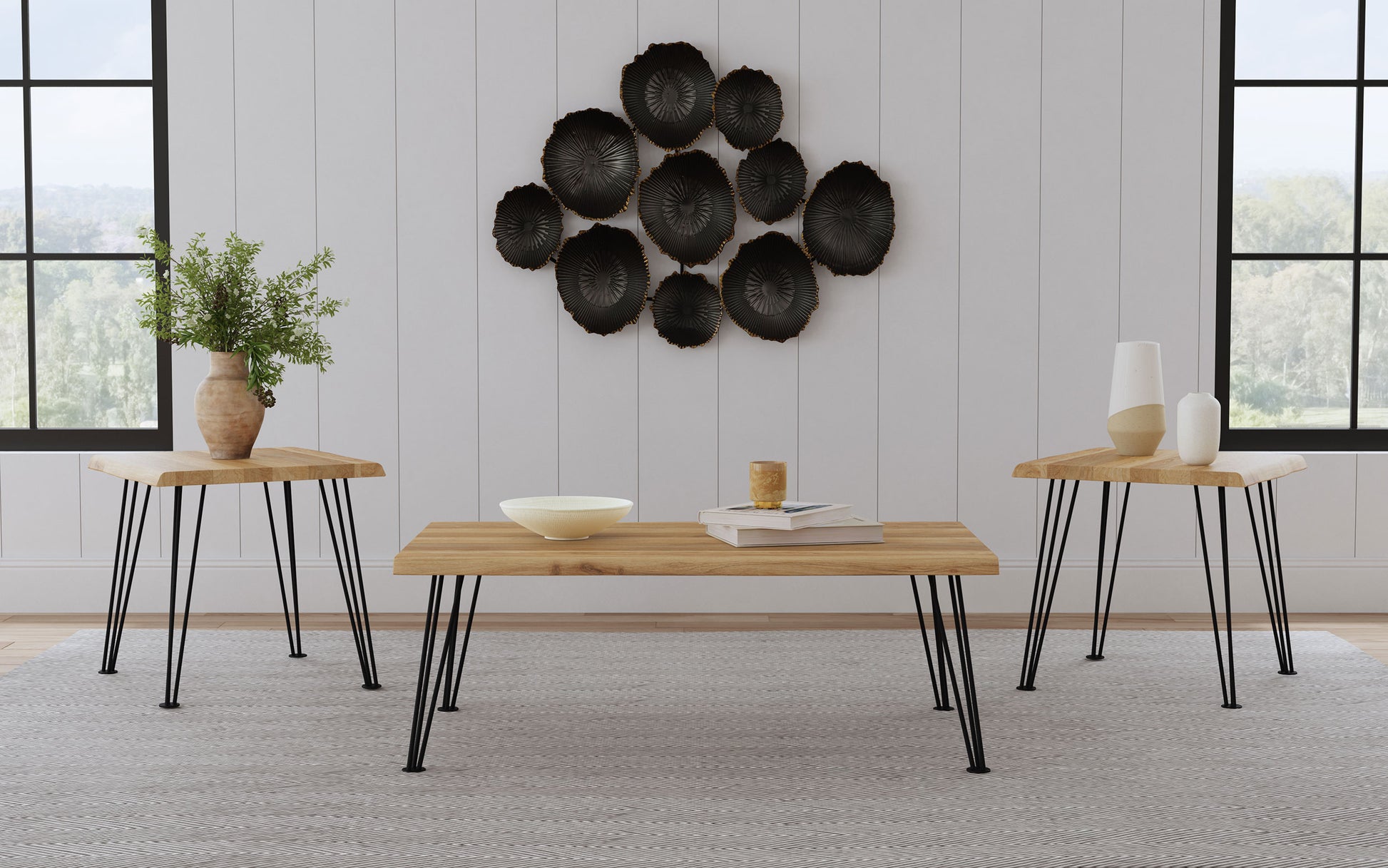This coffee table set combines rustic charm with industrial modern aesthetics. Each table features a solid acacia wood top with a natural finish, highlighting unique grain patterns. Supported by solid iron hairpin legs in a matte black powder-coated finish, the set offers both durability and a sleek design. Perfect for creating a cohesive look, this occasional table set brings functionality and style to living spaces.