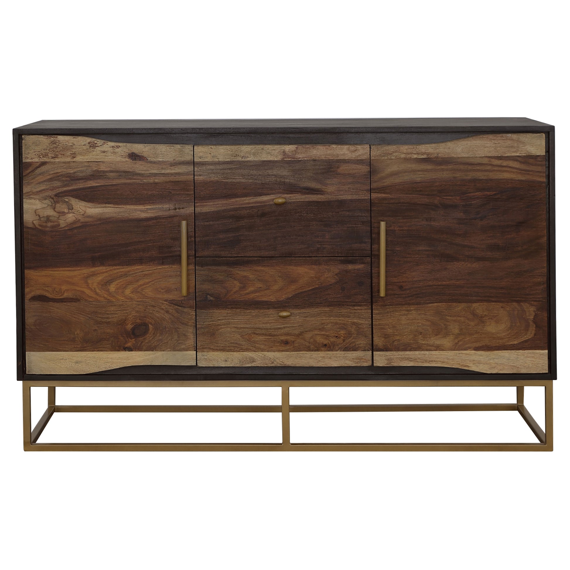 An outstanding handcrafted wood accent table from India, this piece flaunts a range of natural wood colors. Two cabinet drawers boast sleek gold bar pulls. Meanwhile, two center drawers offer additional storage space. The gold geometric base ties the entire look together. Use this piece in eclectic style living spaces.