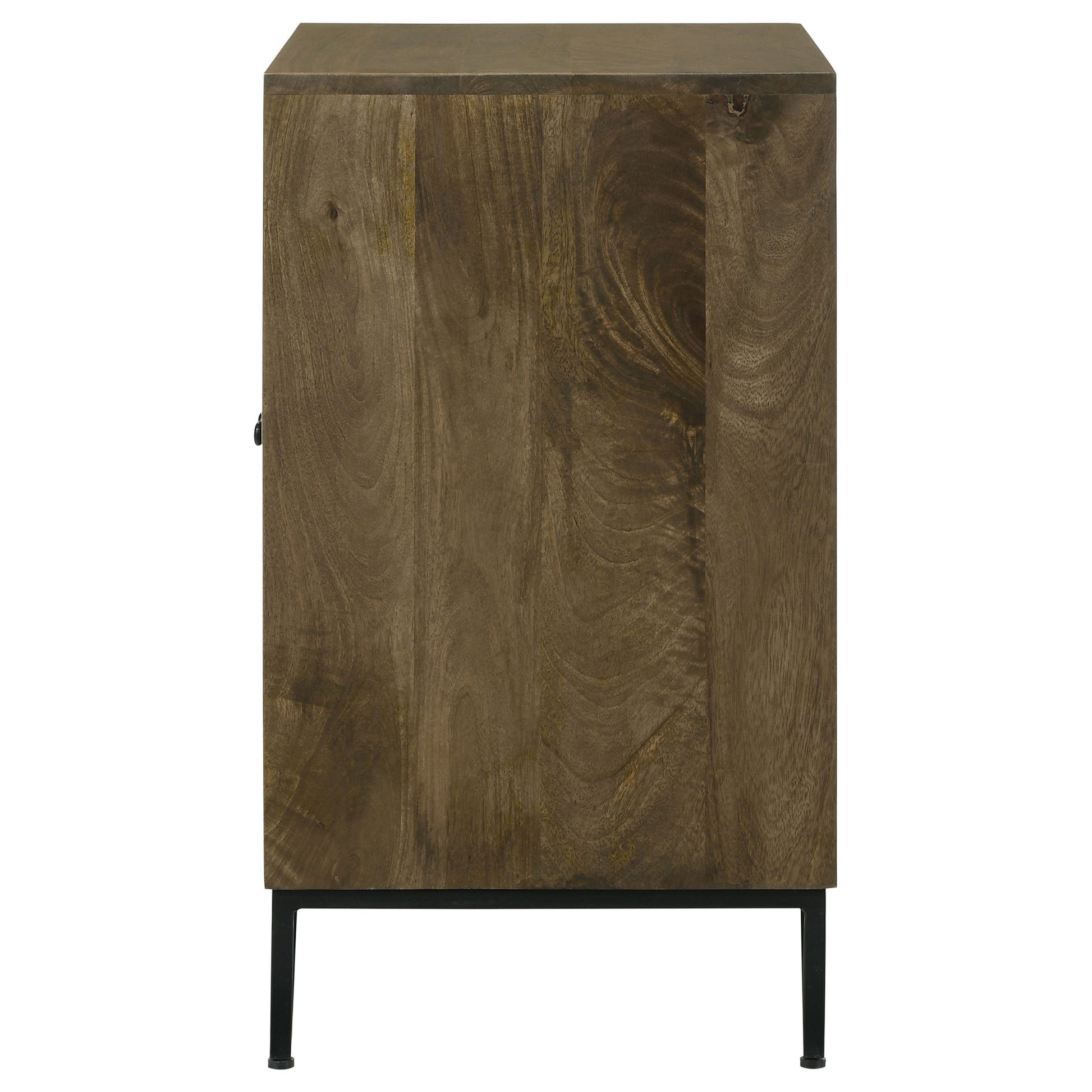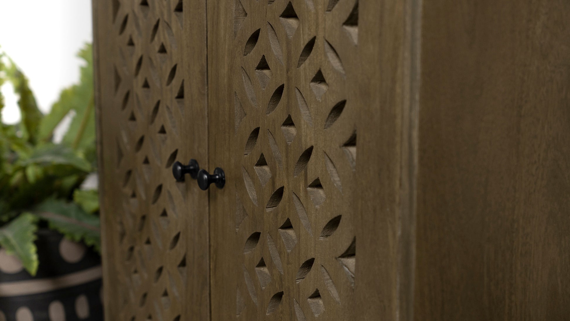 Decorative cutout designs on front doors embellish the artisan motif of this transitional accent cabinet. Versatile style and a spacious interior sets up a perfect well-rounded venue for your space, making a de-clutter effort easy. Brown finish mango wood and MDF construction starts out right to add romantic rustic vibes. Open side-by-side front doors to reveal a single shelf ready to hide whatever you need. Black finished metal doorknobs add a charming look to this delightful cabinet.